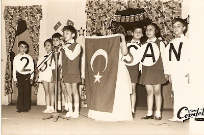 Bu da 1971 yılından... İlkokulun sahnesinde bir 23 Nisan töreni anı... En solda mandolin çalar gibi gözüken bendeniz Cihan... Yanımda sıralanan sınıf arkadaşlarım; Ayşe, Hasan (Şimdilerde Facebook'ta bulduk birbirimizi), Şişko Mehmet (Okul müdürümüz Kamil beyin oğluydu) akerdeon'da Adnan Bakkal, Alper ve Mahir...